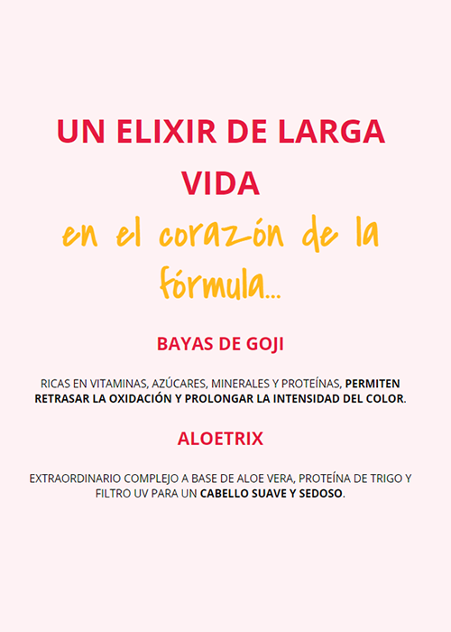 BAYAS DE GOJI: Originarias del Tíbet, estas bayas se consideran un elixir de larga vida. Ricas en vitaminas, azúcares, minerales y proteínas, ayudan a retardar la oxidación para prolongar la intensidad del color.